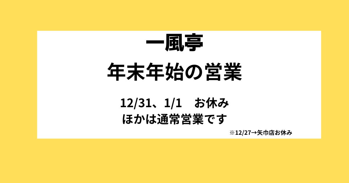 ホーム / お知らせ / 年末年始営業のお知らせ お知らせ 年末年始営業のお知らせ 時 2025年12月1日2025年12月1日 年末年始は下記の営業です! 12/27(土)・・・高松店通常営業 ※矢巾口店お休み 12/28(日)・・・通常営業 12/29(月)・・・通常営業 12/30(火)・・・通常営業 12/31(水)・・・お休み 1/1(木)・・・お休み 1/2(木)・・・通常営業 1/3以降は通常営業です! 今年の年末年始もよろしくお願いいたします